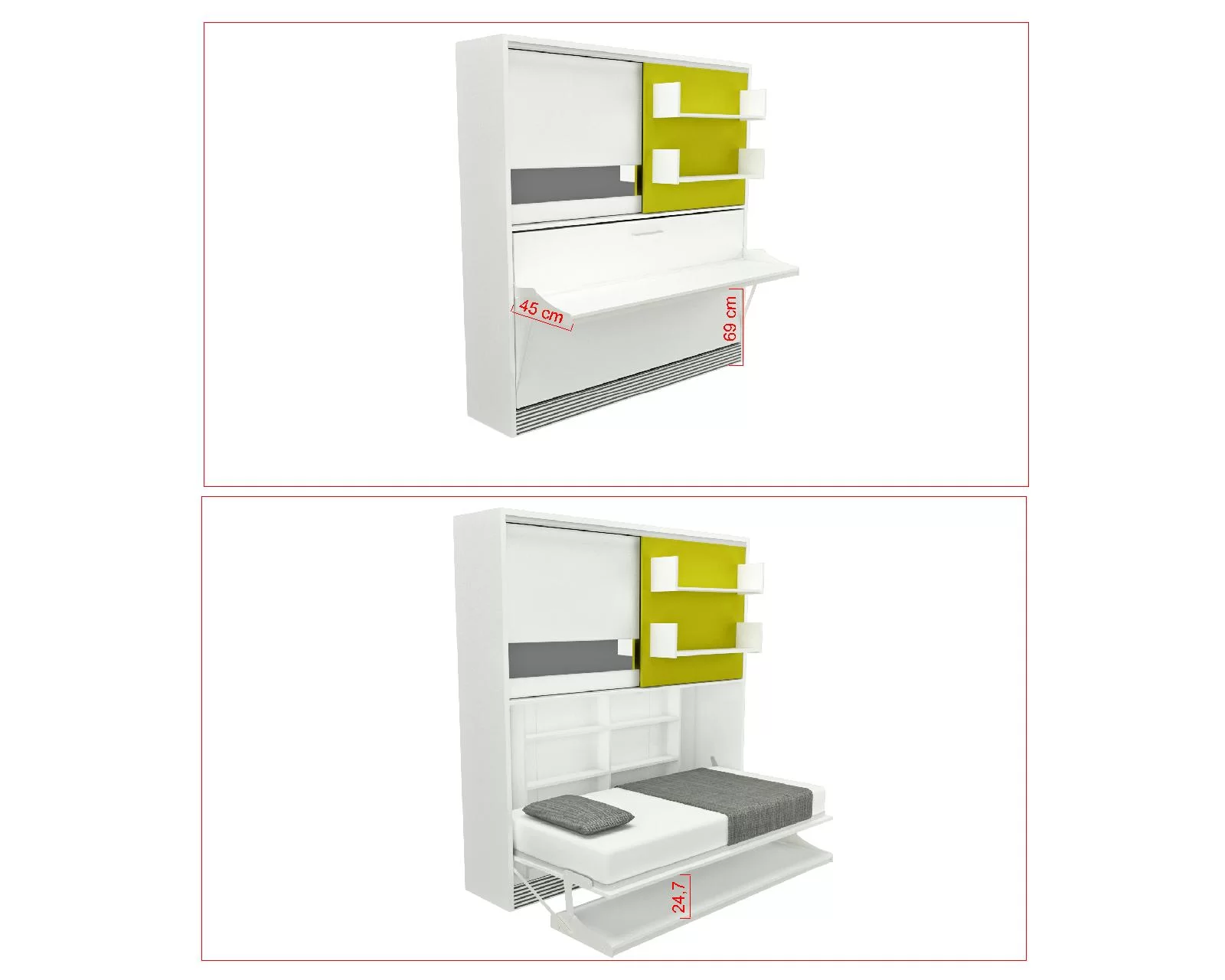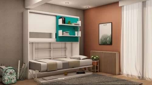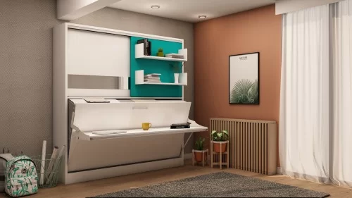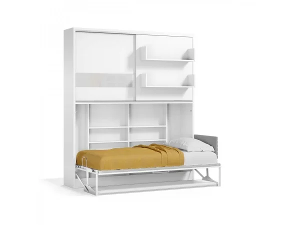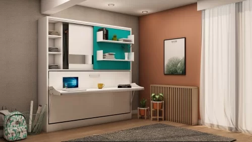Deze eenpersoons bedkast Academy is ideaal voor elke studentenkamer deze Eenpersoons bedkast Academy id een zijwaarts te openen bedkast. Kastruimte voorzien van schuifdeuren. Een 2 meter lange bureaufunctie, dankzij het speciale mechanisme blijven alle items op het bureau staan tijdens het openen en sluiten van het bed. Eventueel te leveren met hoofdbordje in de kleur grijs tegen meerprijs.
