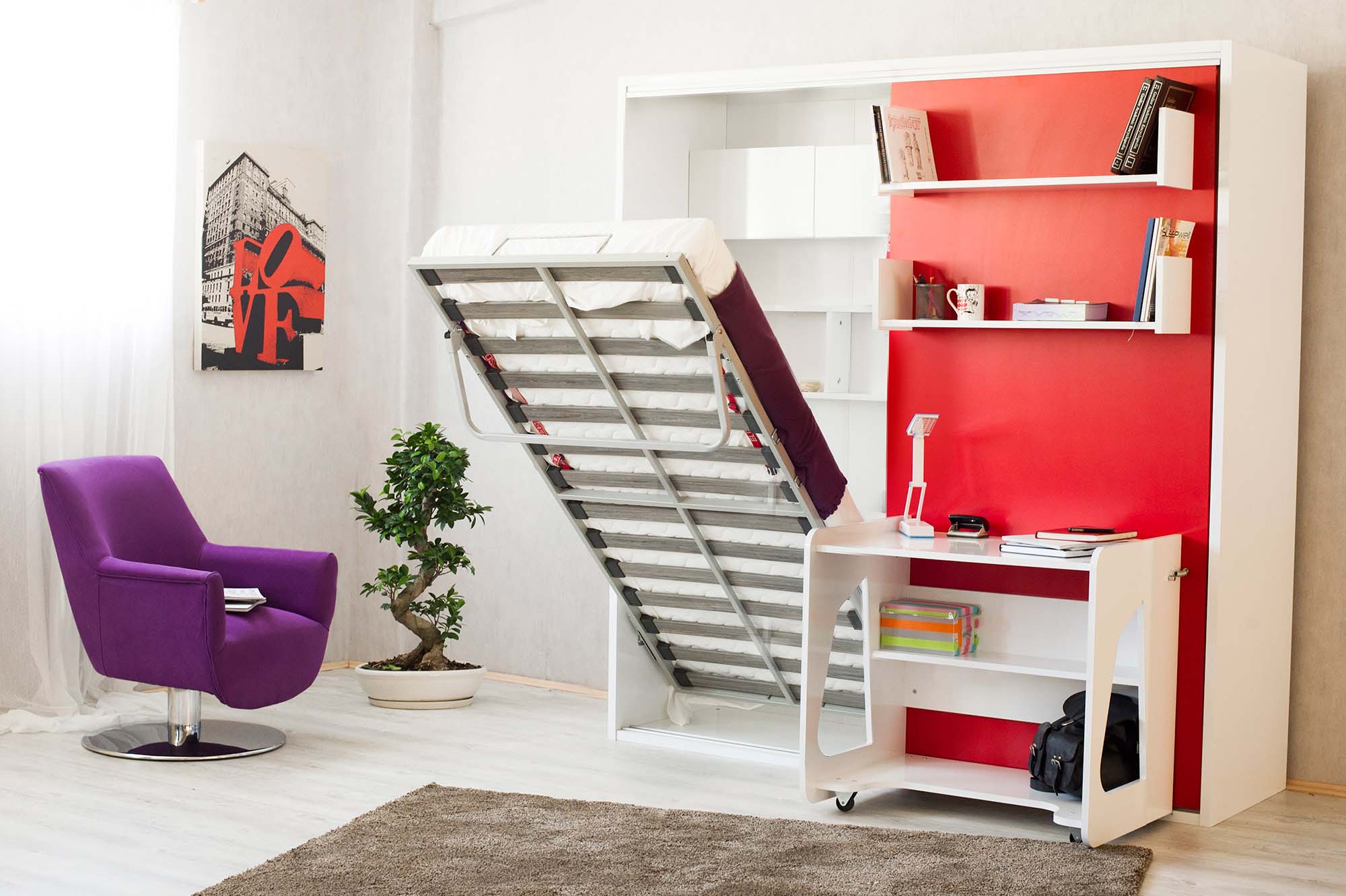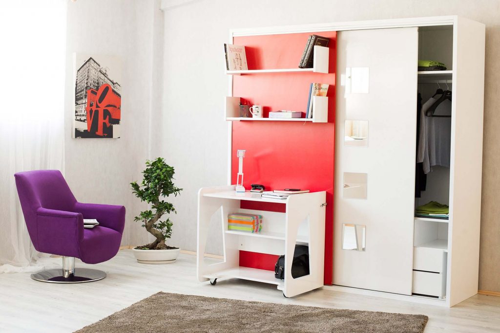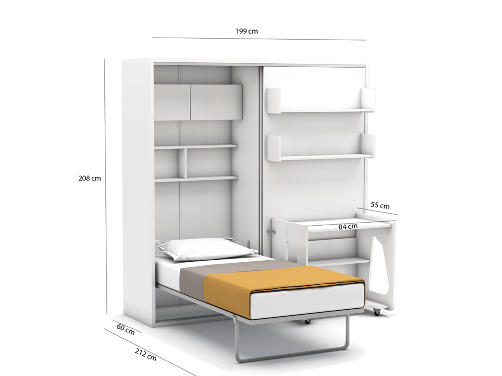 Deze transformeerbare unit combineert een verticaal te openen eenpersoonsbed, een brede kledingkast met lades en kast, een bureau, een boekenkast en een decoratieve spiegel. Hier heb je alles voor een tienerkamer met slechts één transformeerbaar meubel. Bedkant kan veranderen.