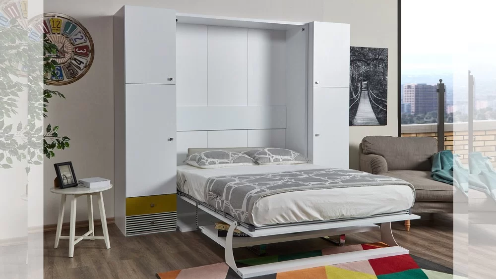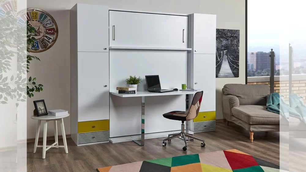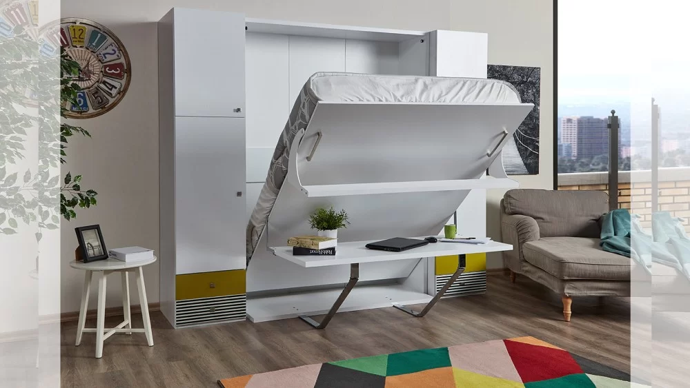Lekker slapen in het tweepersoonsbed, Diva 1111 met bureau. Het tweepersoonsbed klapt naar voren open. De spulletjes kunnen gewoon op de tafel blijven staan wanneer men het bed opent of sluit.